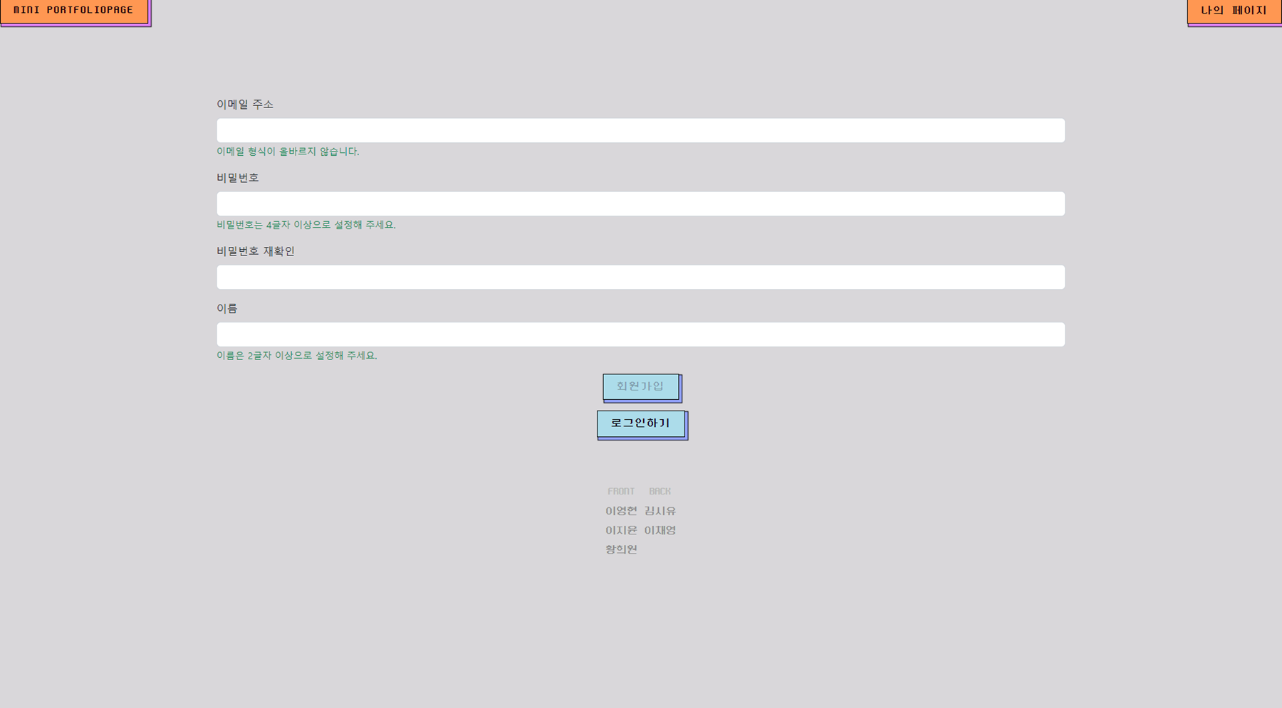 → 로그인/회원가입 시 이메일, 비밀번호 validation (이메일 형식, 비밀번호 최소 글자)