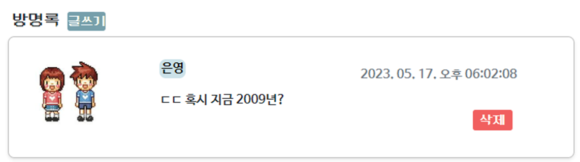 작성자의 프로필 사진, 이름과 작성 일시, 삭제 버튼을 넣었다. 방명록을 작성할 때 DB에 authorName도 저장해 뒀기 때문에 작성자의 작성 당시 이름이 보여서 이름을 바꿔도 이전의 이름으로 보인다. 다만, 사진은 authorId로 그 작성자의 user 객체에 접근하여 이미지를 가져오는 것으로 변경되면 방명록에 보이는 그림도 함께 바뀐다.