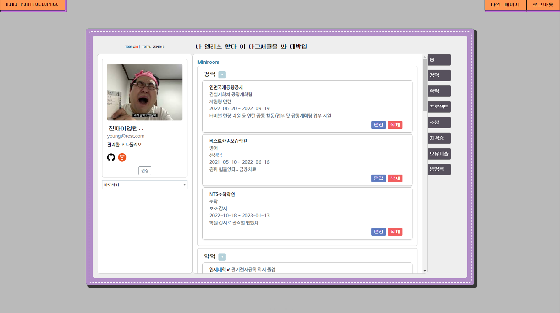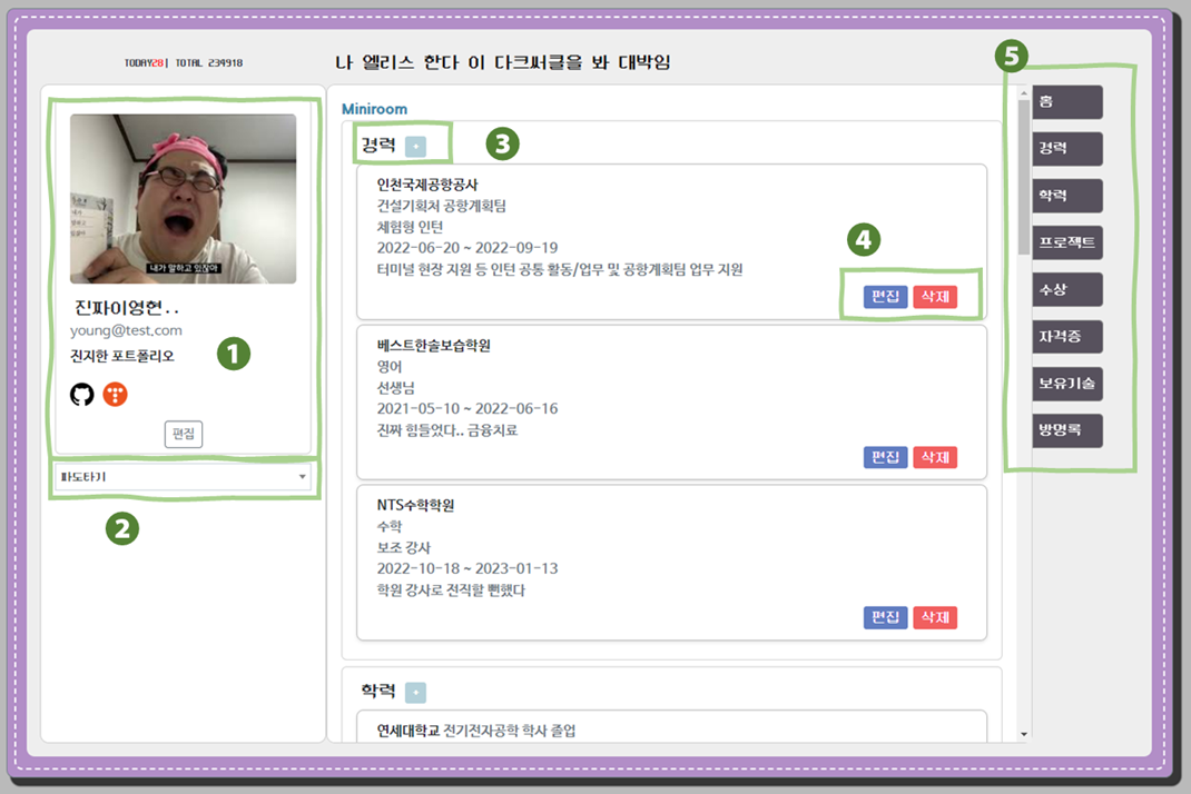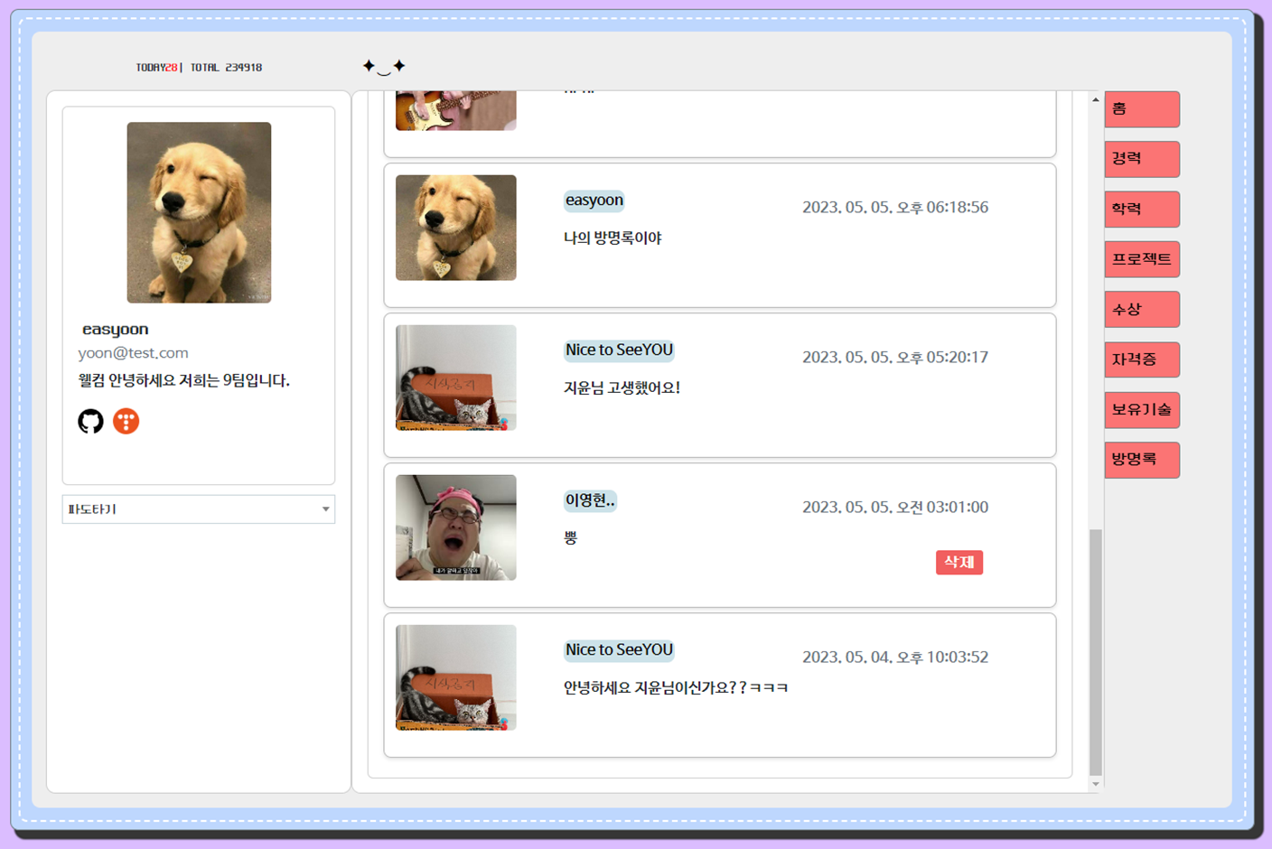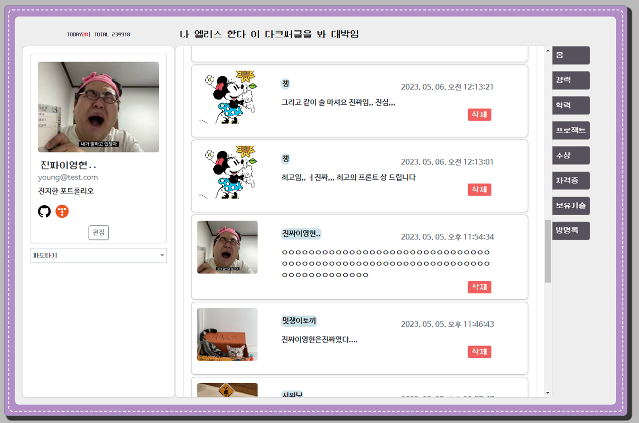- 방명록 기능: 개인 페이지에서 누구나 글을 작성할 수 있는 공간, 삭제 기능 추가