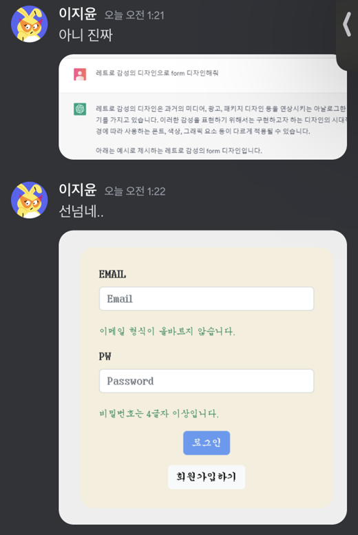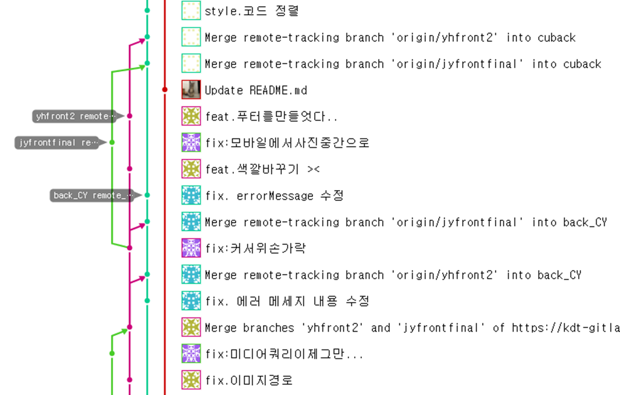 개발을 진행하면서 디테일한 것들을 맞춰 가다 보니 대화를 수시로 할 수 있었던 점은 좋았다. 백엔드 시유 님의 시원시원한 의사 결정과 채영 님의 꼼꼼함, 지윤 님의 집념이 나에게 큰 동기 부여가 되었다. 무엇보다 다들 힘든 내색 하나 하지 않고 해야 할 일을 뚝딱 해내는 모습이 존경스러웠다.
