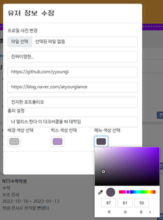 user DB에 새로운 변수를 만들어 저장하고, 페이지를 렌더링할 때마다 저장된 hexaCode를 가지고 CSS에 반영했다. 이것 또한 작성하지 않으면 싸이월드 기본 색상으로 나타난다.