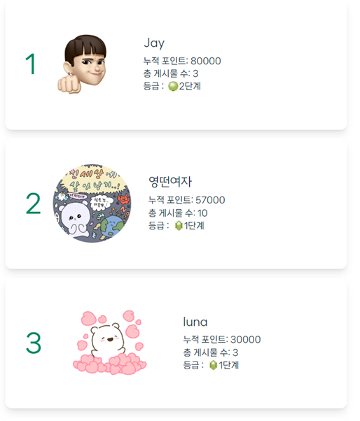 - 피드 작성 포인트를 바탕으로 유저 랭킹 표시