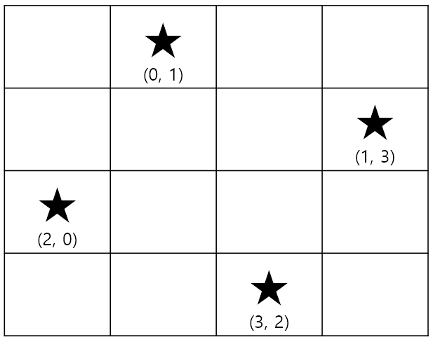 일차원 배열 points를 선언하여 index를 행 번호, index에 해당하는 값을 y 좌표로 관리할 수 있다.